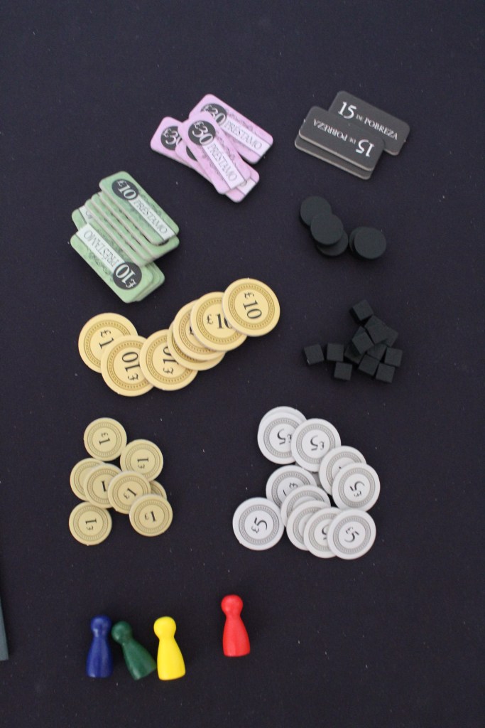 Los componentes son lo más decepcionante del juego hay troquel para el dinero, los préstamos y las 15 de pobreza (duele mucho poseer esta ficha). Además para la pobreza también se usan figuras de madera con distinta geometría según su valor: cubo (1) y cilindro(5).