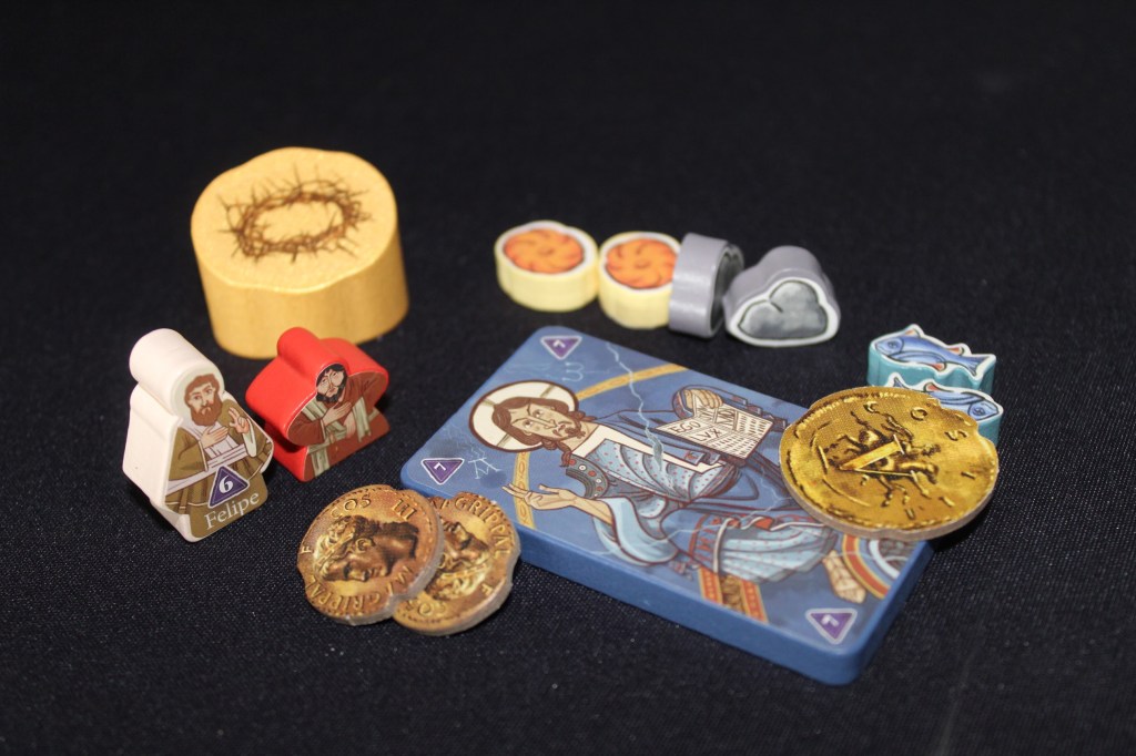 El juego cuenta con una gran cantidad de componentes, siendo lo más llamativo las pegatinas, que hay que poner sobre las figuras para darle un mejor aspecto. De hecho hay pegatinas para poner sobre los apóstoles en diferentes idiomas. El trabajo de pegarlas es laborioso y puede que aborrezca al principio, pero el resultado final es mas que satisfactorio.