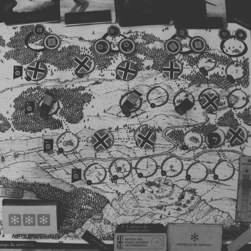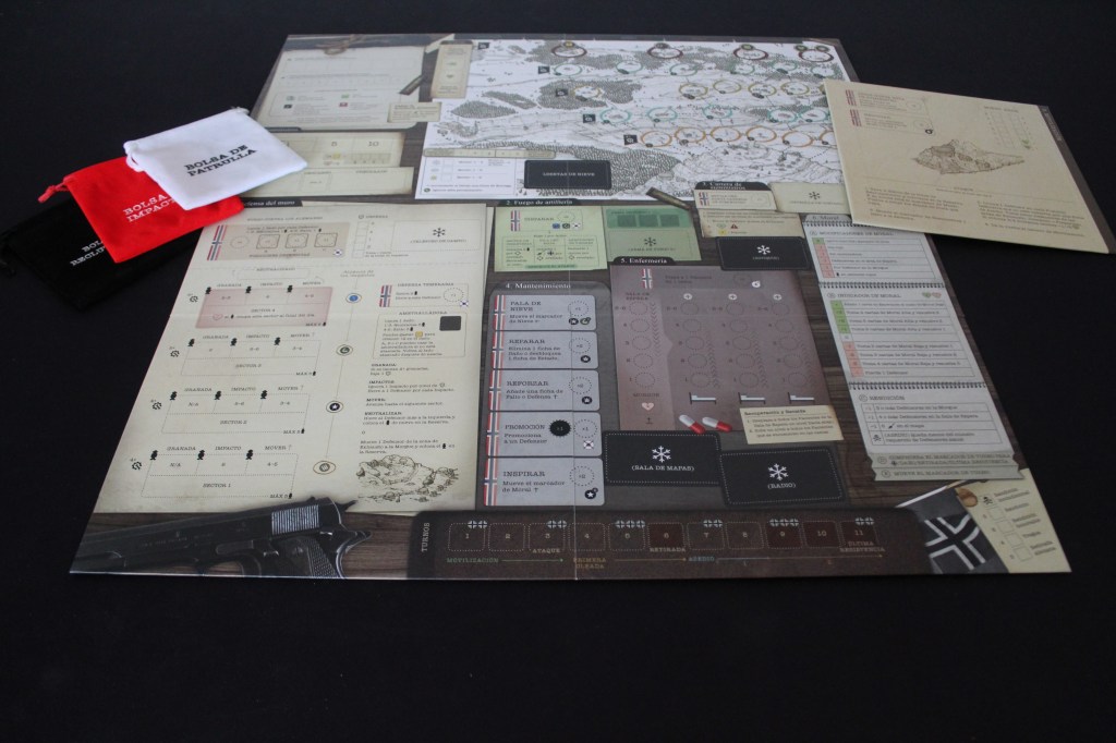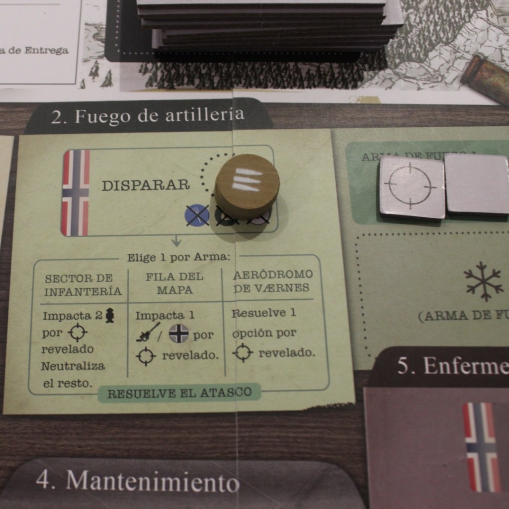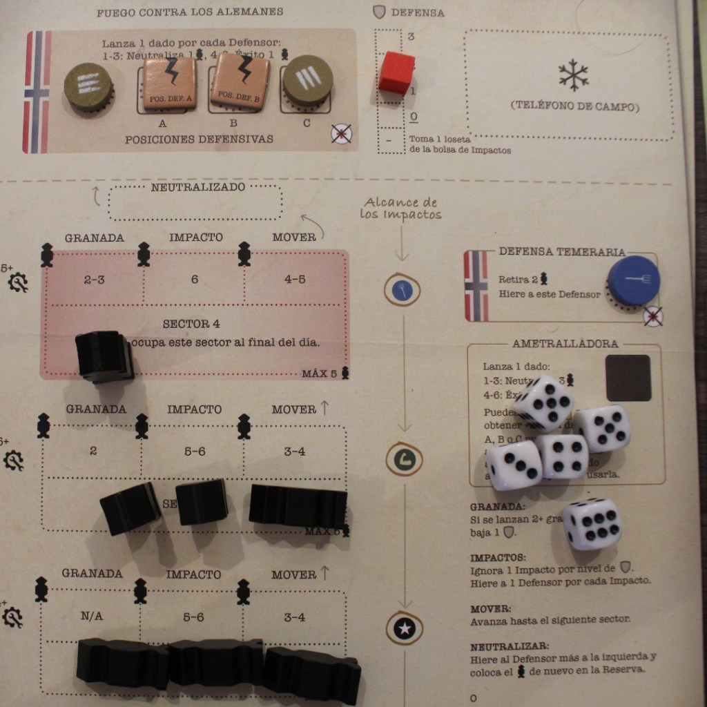 A simple vista, La Fortaleza de Hegra no es un juego que destaque en el apartado artístico. No parece innovar frente a otros wargame y presenta ciertas similitudes con los otros juegos ilustrados por Joeri Lefevre. Sin embargo, a medida que te familiarizas con el juego, puedes empezar a entender la estructura del tablero, que está muy bien pensada: la parte superior para los alemanes y la parte inferior para el bando noruego. Además, las distintas secciones de acciones que se encuentran en el mapa, hacen que casi no se necesite la hoja de ayuda que trae el manual en la parte de atrás.