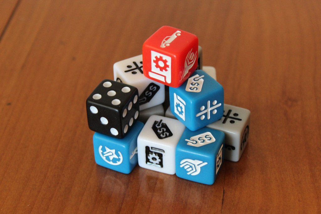 Los componentes son básicamente meeples de madera: un coche, cinco tazas de café que representan a la tan molesta auditoría y 5 llaves para la expansión de “Los hermanos Bob”. Aparte de los meeples, el juego contiene una enorme cantidad de hojas y muchos dados, evidentemente es un Roll & Write.