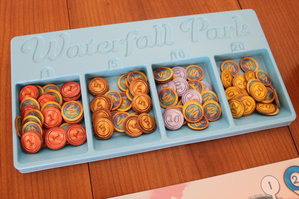 En cuanto a los componentes, Waterfall Park viene bien servido con: unos bien pensados insertos, varias planchas de troquel (monedas, atracciones y marcador de ronda), varias piezas de plástico de diferentes, para marcar las parcelas, y un tablero con insertos para las parcelas 🧩.