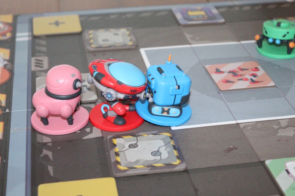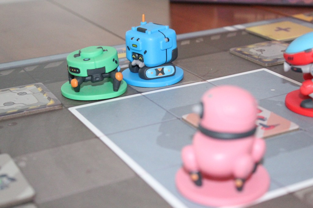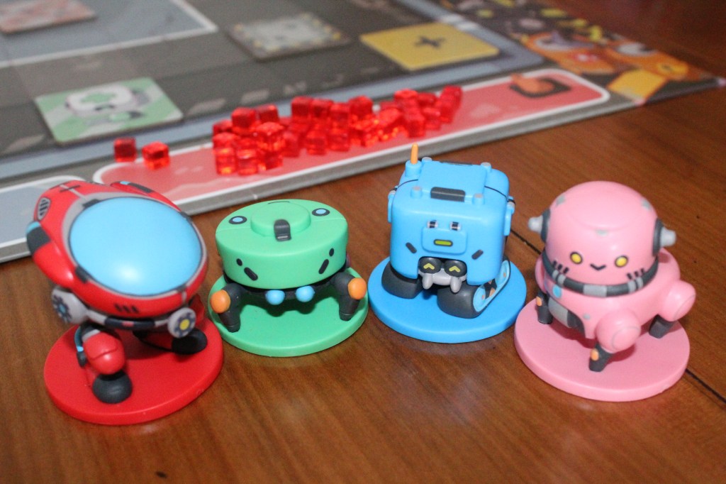 Los componentes son casi insuperables, pues el juego viene con: un tablero de 2×3 que forma la arena, varias losetas de troquel de aproximadamente 3mm (para los tableros de jugador o las losetas especiales), cubos de color azul y rojo para marcar los puntos, y cuatro miniaturas pintadas de gran tamaño (6 cm) que representan a los robots. Sí, en efecto vienen pintadas, aspecto que casi no tiene precedentes en los juegos que incluyen miniaturas.